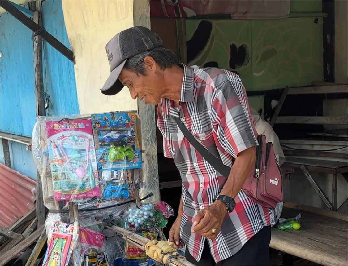 Di antara para penerima manfaat, ada satu sosok yang kisahnya begitu membekas, Bapak Sopian. Selama kurang lebih delapan tahun, ia menjalani hidup sebagai pedagang mainan panggul. Setiap hari, ia berjalan dari kampung ke kampung, membawa berbagai mainan anak-anak di pundaknya. Dari mobil-mobilan hingga balon warna-warni, semua ia jajakan dengan harapan sederhana, agar dagangannya laku hari itu.