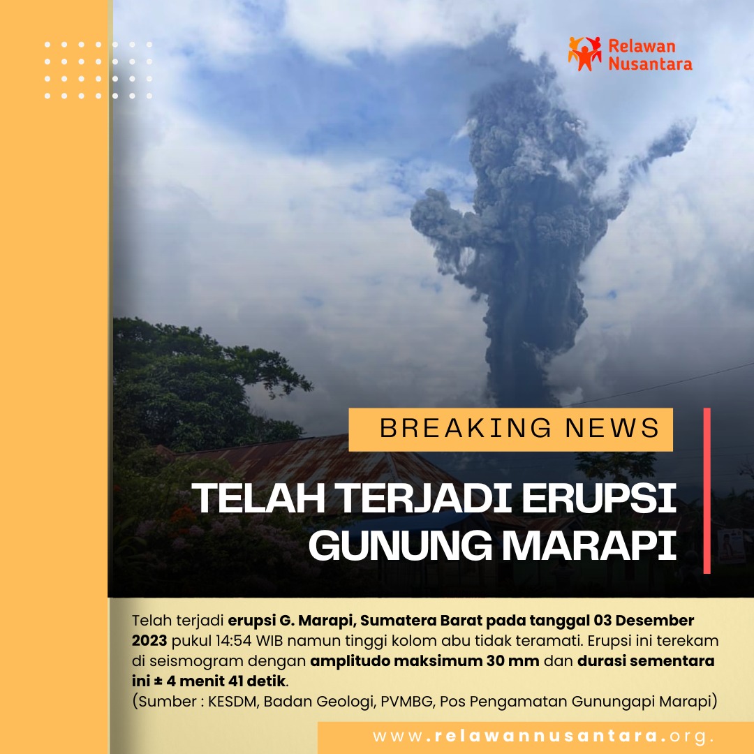 • Terjadi erupsi G. Marapi pada hari Minggu, 03 Desember 2023, pukul 14:54 WIB. Tinggi kolom letusan teramati ± 3000 m di atas puncak (± 5891 m di atas permukaan laut). Kolom abu teramati berwarna kelabu dengan intensitas tebal ke arah timur. Saat laporan ini dibuat, erupsi masih berlangsung.