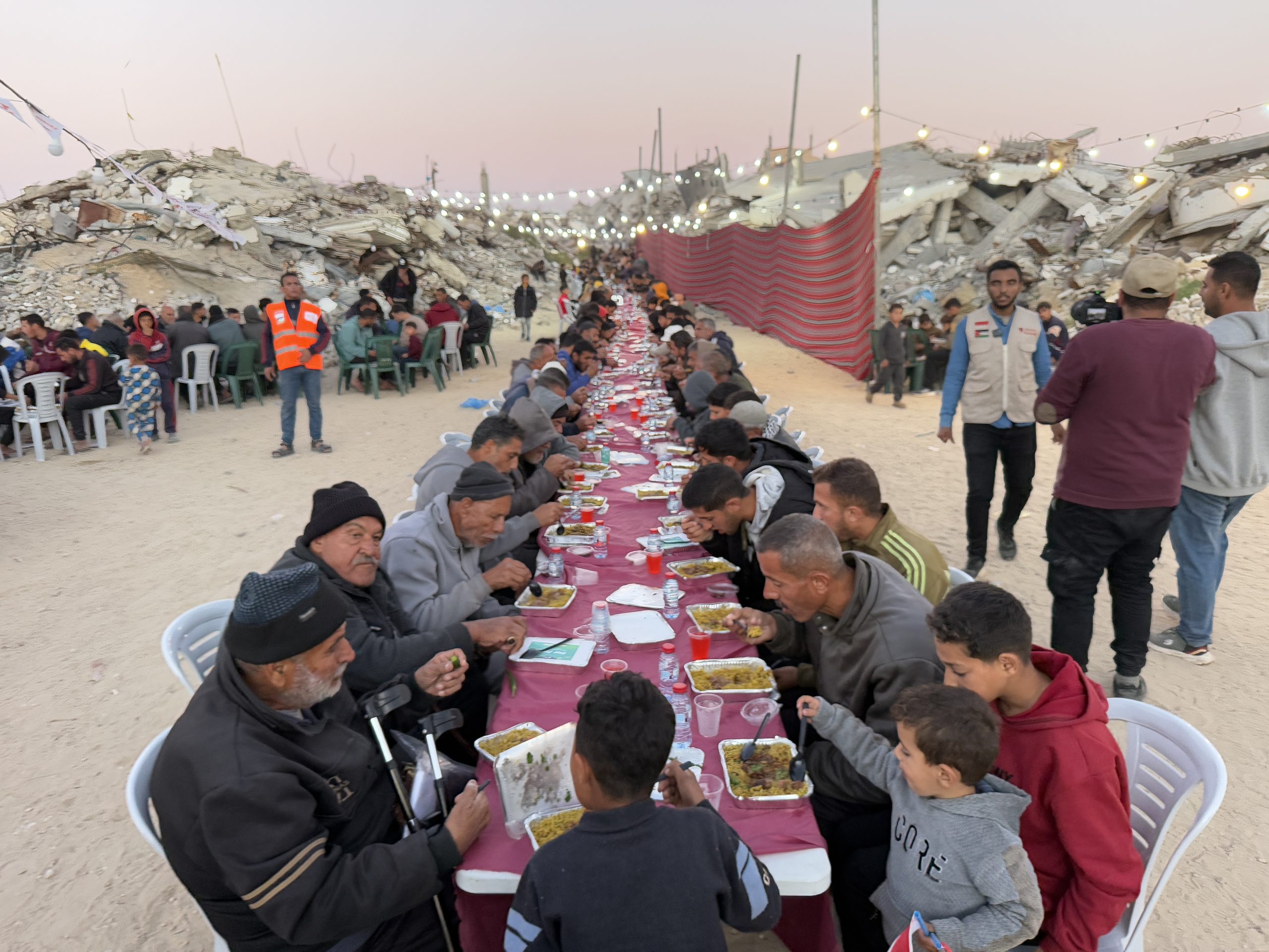 Ketika adzan Maghrib berkumandang di Gaza Utara, suasana berubah hening. Di tengah bangunan yang hancur, 1.500 orang duduk berdampingan. Tidak ada kemewahan, tetapi ada kebersamaan. Tidak ada gedung megah, tetapi ada doa yang terangkat hampir bersamaan.
