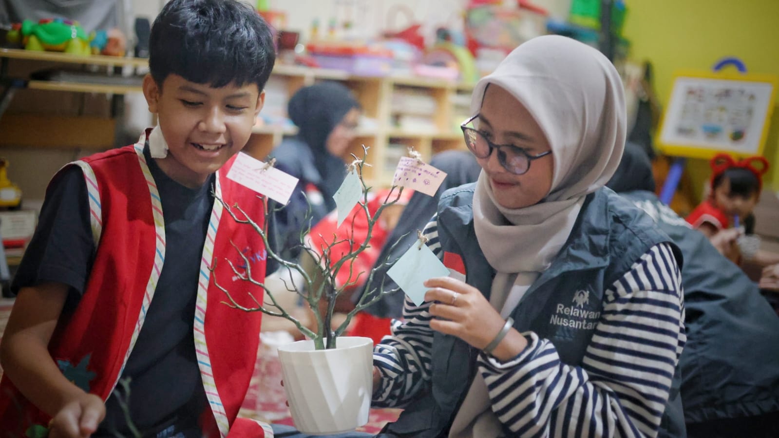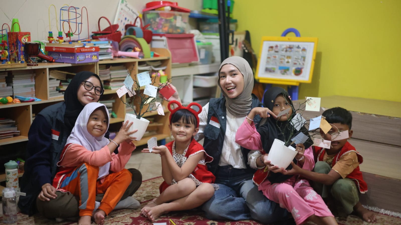 Salah satu kegiatan yang paling menyentuh dalam program ini adalah membuat Pohon Harapan. Para relawan menyiapkan kertas-kertas kecil yang kemudian dibagikan kepada anak-anak. Di atas kertas itu, mereka menuliskan doa dan harapan yang tersimpan di hati mereka.