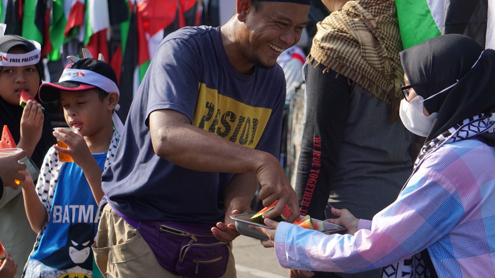 RELAWAN NUSANTARA MEMBAGIKAN MINUM DAN MAKANAN RINGAN UNTUK RIBUAN MASA YANG HADIR DI AKSI BELA PALESTINA DI DEPAN GEDUNG KEDUBES AS